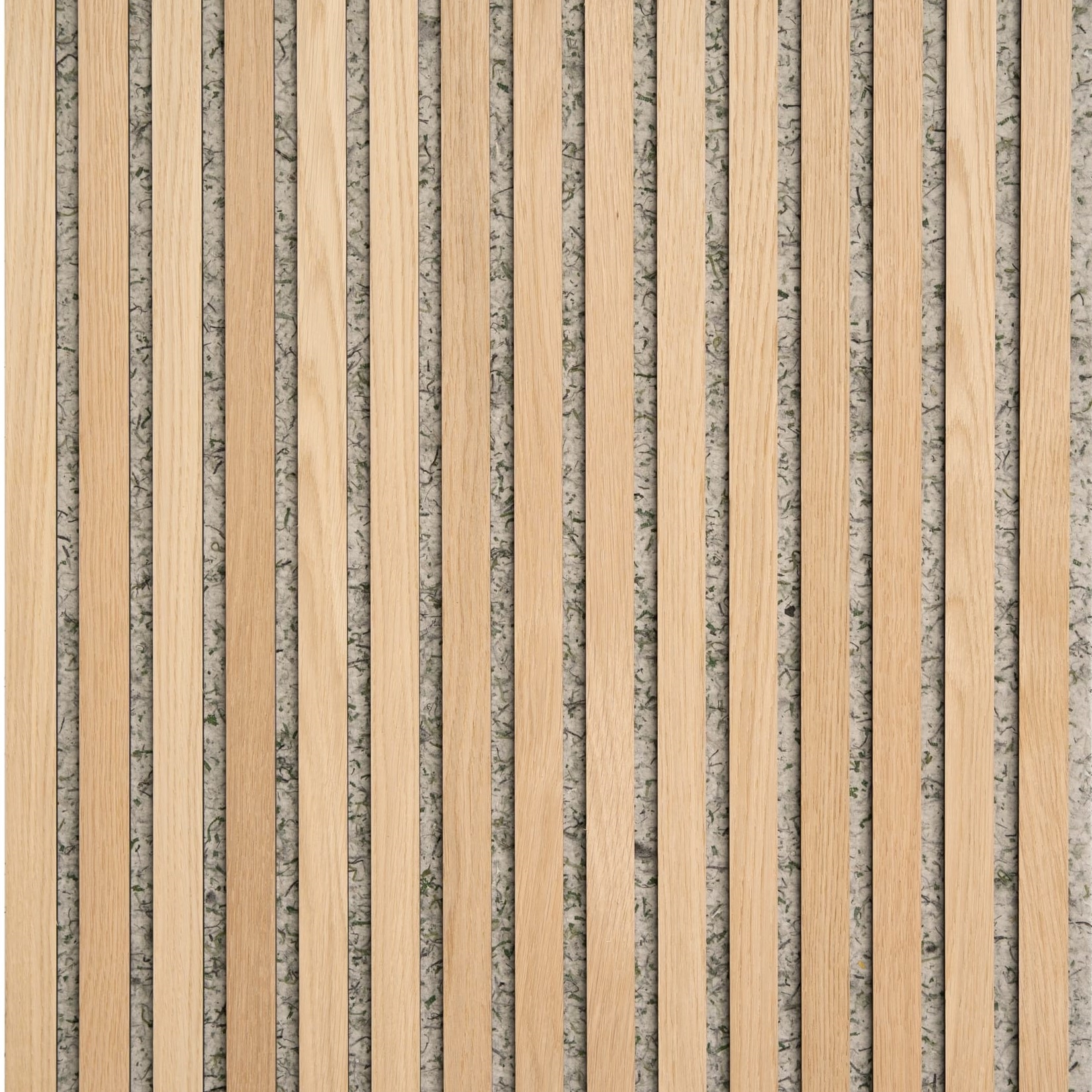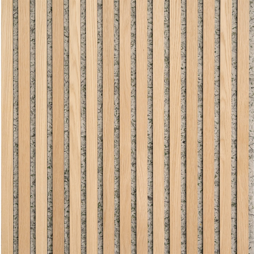 Es handelt sich um ein Akustikpaneel, bei dem der Filz zu 65 % aus recycelten Kunstrasenplätzen von Trainingsanlagen von Profi-Fußballvereine besteht. Kunstgras wird in kleine Stücke geschnitten und dann zu einem Filz vermischt, was dem Paneel einen einzigartigen Ausdruck verleiht. Lamellen aus MDF mit einem Echtholzfurnier auf der Vorderseite sind das letzte Finish, der unsere Akustikpaneele definiert.